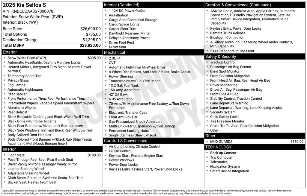 Snow White Pearl 2025 Kia Seltos S AWD CVT 2.0L I4 MPI 2025 Kia Seltos S in Snow White Pearl with Cloth.
