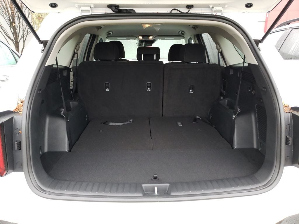 Equipped with 17 Alloy Wheels, 3rd row seats: split-bench, 4-Wheel Disc Brakes, 6 Speakers, ABS brakes, Air Conditioning, All Weather Floor Mats, Alloy wheels, AM/FM radio: SiriusXM, Apple CarPlay & Android Auto, Auto High-beam Headlights, Brake assist, Bumpers: body-color, Cloth Seat Trim, Delay-off headlights, Driver door bin, Driver vanity mirror, Dual front impact airbags, Dual front side impact airbags, Electronic Stability Control, Emergency communication system: 911 Connect, Exterior Parking Camera Rear, Four wheel independent suspension, Front anti-roll bar, Front Bucket Seats, Front Center Armrest, Front reading lights, Fully automatic headlights, Heated door mirrors, Illuminated entry, Knee airbag, Leather Shift Knob, Leather steering wheel, Low tire pressure warning, Occupant sensing airbag, Outside temperature display, Overhead airbag, Overhead console, Panic alarm, Passenger door bin, Passenger vanity mirror, Power door mirrors, Power steering, Power windows, Radio data system, Radio: AM/FM Standard Sound System, Rear anti-roll bar, Rear reading lights, Rear seat center armrest, Rear side impact airbag, Rear window defroster, Rear window wiper, Remote keyless entry, Security system, Speed control, Speed-sensing steering, Split folding rear seat, Spoiler, Steering wheel mounted audio controls, Tachometer, Telescoping steering wheel, Tilt steering wheel, Traction control, Trip computer, Turn signal indicator mirrors, and Variably intermittent wipers.