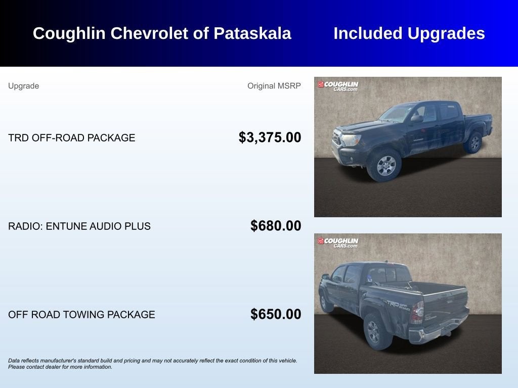 2015 Toyota Tacoma Base V6Awards:* JD Power Initial Quality Study (IQS), Vehicle Dependability Study * JD Power Initial Quality Study (IQS), Vehicle Dependability Study (VDS) * JD Power Initial Quality Study (IQS) * ALG Residual Value Awards, Residual Value Awards * 2015 KBB.com Best Resale Value Awards Please call or e-mail first for the best and quickest information. Visit www.coughlinpataskala.com to see more of this store’s new and used vehicle inventory for sale. Price excludes tax, title, license and document fee. While we make every effort to prevent pricing errors, key stroke and human errors do occur. Please contact dealer for details.