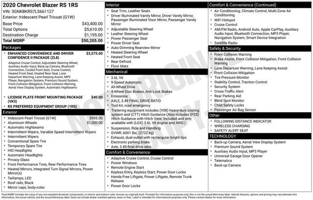 170 Amp Alternator, 3.49 Final Drive Axle Ratio, 4-Wheel Disc Brakes, 6 Speakers, 6-Speaker Audio System Feature, 6-Way Power Front Passenger Seat Adjuster, ABS brakes, Advanced Adaptive Cruise Control, Air Conditioning, Alloy wheels, AM/FM radio: SiriusXM, Apple CarPlay/Android Auto, Auto-dimming door mirrors, Auto-dimming Rear-View mirror, Automatic temperature control, Brake assist, Bumpers: body-color, Child-Seat-Sensing Airbag, Compass, Delay-off headlights, Driver door bin, Driver vanity mirror, Dual front impact airbags, Dual front side impact airbags, Electronic Stability Control, Emergency communication system: OnStar and Chevrolet connected services capable, Enhanced Automatic Emergency Braking, Enhanced Convenience & Driver Confidence II Pkg, Exterior Parking Camera Rear, Following Distance Indicator, Forward Collision Alert, Four wheel independent suspension, Front anti-roll bar, Front Bucket Seats, Front Center Armrest, Front dual zone A/C, Front Pedestrian Braking, Front reading lights, Fully automatic headlights, Garage door transmitter, HD Surround Vision, Heated door mirrors, Heated Driver & Front Passenger Seats, Heated front seats, Heated Rear Outboard Seating Positions, Heated steering wheel, Heavy-Duty Cooling System, High-Intensity Discharge Headlights, Hitch Guidance, Hitch Guidance w/Hitch View, Illuminated entry, IntelliBeam Headlamps, Knee airbag, Lane Keep Assist w/Lane Departure Warning, Leather Shift Knob, Low tire pressure warning, Memory Settings For Driver Seat & Exterior Mirrors, Navigation System, Occupant sensing airbag, Outside temperature display, Overhead airbag, Overhead console, Panic alarm, Passenger door bin, Passenger vanity mirror, Perforated Leather-Appointed Seat Trim, Power door mirrors, Power driver seat, Power Liftgate, Power passenger seat, Power steering, Power Tilt & Telescoping Steering Column, Power windows, Preferred Equipment Group 1RS, Radio data system, Radio: Chevrolet Infotainment 3 Plus System, Radio: Chevrolet Infotainment 3 Premium System, Rear anti-roll bar, Rear Camera Mirror, Rear reading lights, Rear seat center armrest, Rear window defroster, Rear window wiper, Remote keyless entry, Ride & Handling Suspension, Safety Alert Seat, Security system, SiriusXM w/360L, Speed control, Speed-sensing steering, Split folding rear seat, Spoiler, Steering wheel mounted audio controls, Tachometer, Telescoping steering wheel, Tilt steering wheel, Traction control, Trailering Equipment, Trip computer, Turn signal indicator mirrors, Variably intermittent wipers, Ventilated Driver & Front Passenger Seats, Voltmeter, Wheels: 20 Dark Android Machined-Face Aluminum, Wheels: 21 Gloss Black Aluminum, Wireless Charging. 2020 Chevrolet Blazer Priced below KBB Fair Purchase Price!