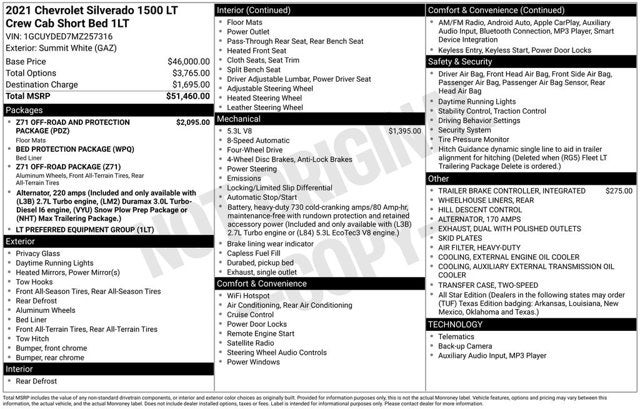 10-Way Power Driver Seat w/Lumbar, 12-Volt Rear Auxiliary Power Outlet, 170 Amp Alternator, 2 USB Ports (First Row), 220 Amp Alternator, 3.23 Rear Axle Ratio, 4-Wheel Disc Brakes, 4.2 Diagonal Color Display Driver Info Center, 40/20/40 Front Split-Bench Seat, 4G LTE Wi-Fi Hot Spot Capable, 6 Speakers, ABS brakes, Air Conditioning, All-Star Edition, All-Weather Floor Liner (LPO) (AAK), Alloy wheels, AM/FM radio: SiriusXM, Apple CarPlay/Android Auto, Auto-Locking Rear Differential, Automatic temperature control, Auxiliary External Transmission Oil Cooler, Bed Protection Package, Bluetooth® For Phone, Brake assist, Bumpers: chrome, Chevrolet Connected Access Capable, Chevytec Spray-On Black Bedliner, Chrome Grille, Chrome Mirror Caps, Cloth Seat Trim, Color-Keyed Carpeting Floor Covering, Compass, Convenience Package, Deep-Tinted Glass, Delay-off headlights, Driver door bin, Driver vanity mirror, Dual Exhaust w/Polished Outlets, Dual front impact airbags, Dual front side impact airbags, Dual-Zone Automatic Climate Control, Electric Rear-Window Defogger, Electrical Lock Control Steering Column, Electronic Cruise Control, Electronic Stability Control, External Engine Oil Cooler, EZ Lift Power Lock & Release Tailgate, Front anti-roll bar, Front Center Armrest w/Storage, Front dual zone A/C, Front Frame-Mounted Black Recovery Hooks, Front reading lights, Front Rubberized Vinyl Floor Mats, Front wheel independent suspension, Fully automatic headlights, Heated door mirrors, Heated Driver & Front Outboard Passenger Seats, Heated front seats, Heated Steering Wheel, Heated steering wheel, Heavy Duty Suspension, Heavy-Duty Air Filter, Hill Descent Control, Hitch Guidance, Illuminated entry, Integrated Trailer Brake Controller, Keyless Open & Start, Leather Wrapped Steering Wheel, LED Cargo Area Lighting, Low tire pressure warning, Manual Tilt/Telescoping Steering Column, Occupant sensing airbag, OnStar & Chevrolet Connected Services Capable, Outside temperature display, Overhead airbag, Overhead console, Panic alarm, Passenger door bin, Passenger vanity mirror, Power Door Locks, Power door mirrors, Power driver seat, Power Front Windows w/Driver Express Up/Down, Power Front Windows w/Passenger Express Down, Power Rear Windows w/Express Down, Power steering, Power windows, Preferred Equipment Group 1LT, Premium audio system: Chevrolet Infotainment 3, Radio data system, Radio: Chevrolet Infotainment 3 System, Rear 60/40 Folding Bench Seat (Folds Up), Rear Dual USB Charging-Only Ports, Rear reading lights, Rear Rubberized-Vinyl Floor Mats, Rear step bumper, Rear Vision Camera, Rear Wheelhouse Liners, Rear window defroster, Remote keyless entry, Remote Vehicle Starter System, Security system, SiriusXM Radio, Speed control, Speed-sensing steering, Split folding rear seat, Standard Tailgate, Steering Wheel Audio Controls, Steering wheel mounted audio controls, Tachometer, Telescoping steering wheel, Theft Deterrent System (Unauthorized Entry), Tilt steering wheel, Traction control, Trailering Package, Trip computer, Variably intermittent wipers, Voltmeter, Wheels: 17 x 8 Bright Silver Painted Aluminum, Wheels: 18 x 8.5 Bright Silver Painted Aluminum, Z71 Off-Road & Protection Package, Z71 Off-Road Package. 2021 Chevrolet Silverado 1500 LT1 CARFAX One-Owner.
