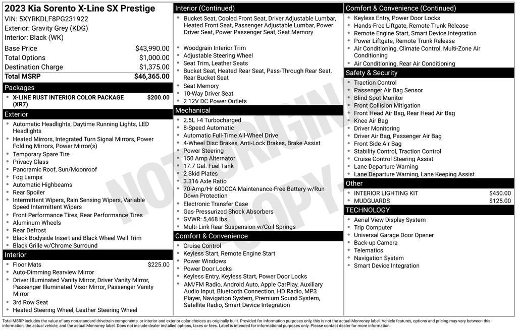 This Sorento's impressive list of features is further enhanced by the Interior Lighting Kit, Carpet Floor Mats, and Mudguards, ensuring a premium and versatile driving experience. With its sleek exterior, spacious and well-appointed interior, and advanced technology, this Sorento is the perfect companion for your adventures, whether you're conquering the daily commute or embarking on a family road trip.