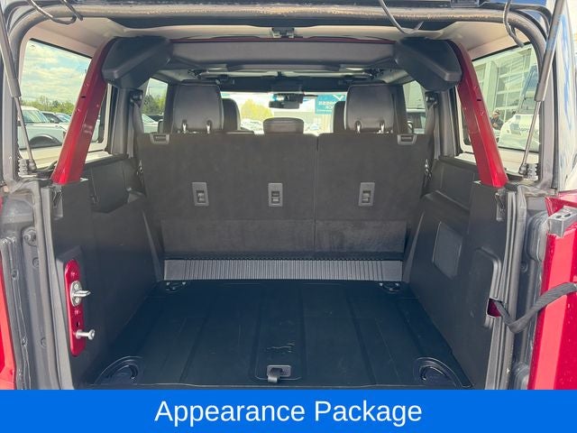 The exterior of this Bronco is finished in a bold and eye-catching Red, complemented by the Black Appearance Package that adds a touch of menacing style with its black grille, door handles, fender flares, and side mirror caps. The Sasquatch Package further enhances the Bronco's off-road prowess with high-clearance fender flares, high-clearance suspension, and position-sensitive Bilstein shock absorbers.